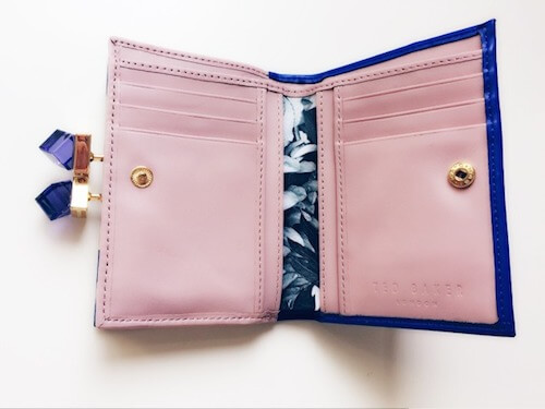 私の財布は今まで長財布が主流でした。でも、年取ったためか、「とにかくバッグが軽くしたい」と思うように。そこで見つけたのが、イギリス、ロンドンに拠点を置くテッドベーカーのスモールスクエアクリスタルウォレット。その名の通りスモール。なのにクリスタルの輝きが高級感を醸し出していて、「大人だけど、可愛いらしさを忘れない」を演出できるお財布です。